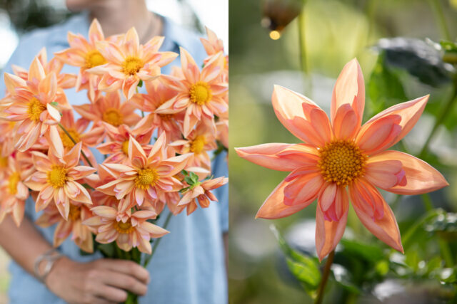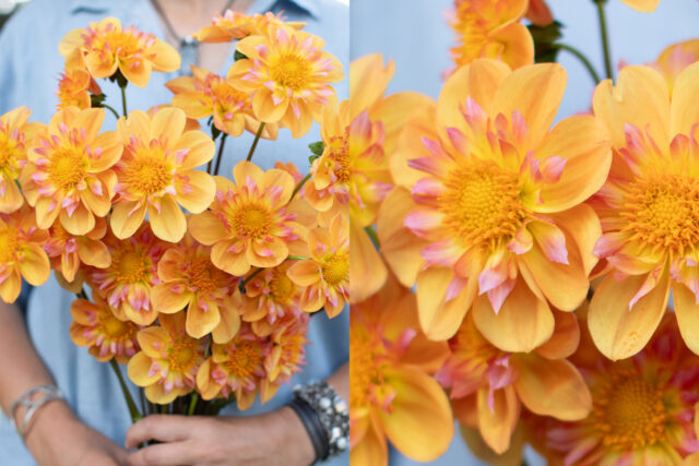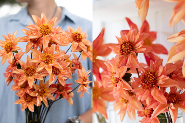 It took me years to find this highly coveted variety, and it was such a treat to finally get a chance to grow it. Plants are bushy and lush and get between 4 and 5 ft tall. Soft peachy-orange outer petals are pointed and roll slightly inward, giving flowers a star-like appearance. A ring of long, matching twizzles is tucked inside each petal, giving blooms a unique textural quality. One of the most interesting surprises was that a few yellow sports popped up in the row—they had the exact same plant habit and flower form, but were highlighter yellow. The one downfall of ‘Venus’ is that it doesn’t hold well in the vase, but it’s still one of the coolest dahlias I’ve ever grown.