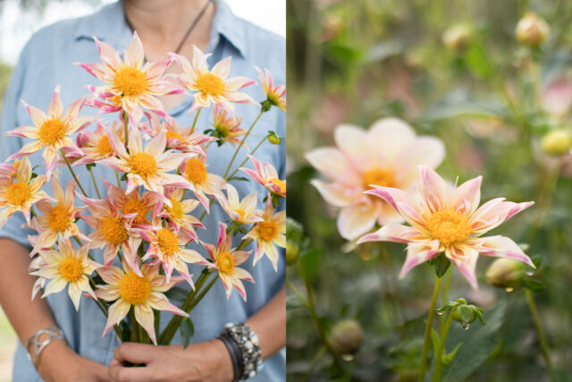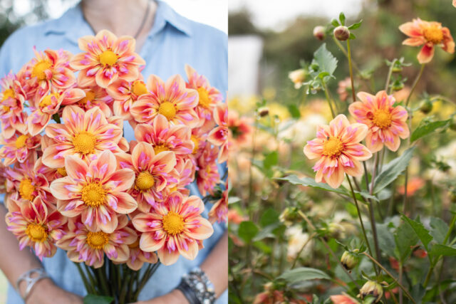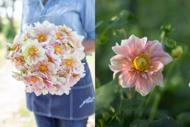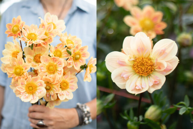 The first collarette variety that I ever grew, it was ‘Appleblossom’ that made me fall in love with this beautiful class of dahlias. It was one of the most popular varieties we grew, both for cut flowers and when we sold tubers, and it was impossible to keep it in stock throughout the season. The delicate-looking flowers last surprisingly well in the vase. Petals start out a soft buttercream and take on a subtle blush wash as they age. Bumblebees absolutely love this variety and it has held a top spot here on the farm since the beginning.