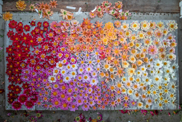 Since I’m so visual, I wanted to compare all of the similar-colored flowers with each other, so after we photographed each one, I cut off all their heads and arranged them side by side.