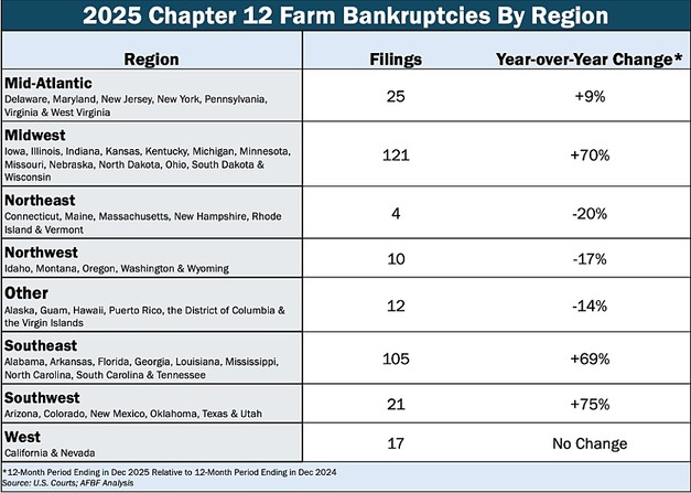 The increase in Chapter 12 filings highlights continued economic pressure in agriculture and signals ongoing challenges for farm financial stability.