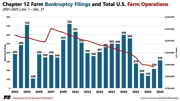 According to U.S. Courts data, 315 Chapter 12 bankruptcies were filed in calendar year 2025, a 46% increase compared with 2024. Although filings remain below earlier historical peaks, the rise marks a second year of growth and points to ongoing strain in agriculture. Chapter 12 filings represent a last-resort option for family farms seeking debt restructuring and do not fully capture broader trends in farm closures.