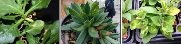 © Jan Byrne, MSU / Heidi Lindberg, MSU ExtensionPhotos 1-3. Symptoms of tomato spotted wilt virus on osteospermum (left), impatiens necrotic spot virus on hens and chicks (middle) and tobacco mosaic virus on petunia (right).