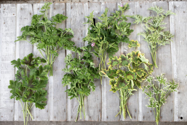 The unforgettable scent of ‘Cinnamon’, a longtime favorite of mine, paired with its dark purple flowers atop green leaves and chocolate-colored stems, makes it a wonderful addition to bouquets. And ‘Mrs. Burns Lemon’, with its bright green leaves and stems, white flowers, and light, citrusy aroma, gives arrangements a fresh, clean look and fragrance.