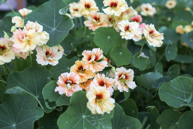 Many years ago, I discovered how wonderful nasturtium vines and flowers are for arranging with. Although they have a delicate appearance, they are surprisingly tough and long lasting in the vase. I love weaving their trailing vines into bouquets, and their leaves remind me of miniature lily pads.