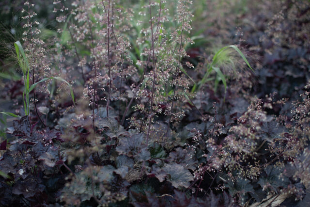 Heuchera flowers are borne on long, wispy wands and make wonderful airy accents, but their leaves are the real draw. The foliage comes in an amazing range of unusual colors, such as plum, chocolate, copper, rust, chartreuse, and pomegranate, and are fantastic in shorter arrangements.