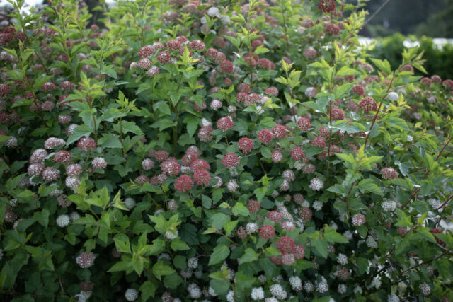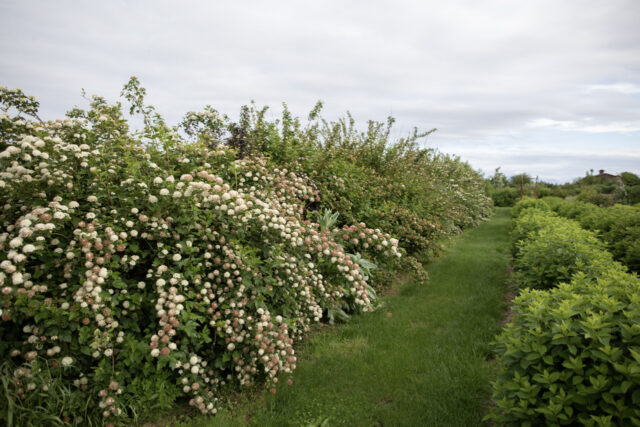 ‘Coppertina’, ‘Diabolo’, and ‘Summer Wine’ all have striking dark foliage. The native Western/Pacific variety has versatile, medium green foliage and beautiful cranberry seedcases.