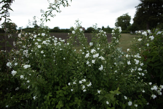 I grow this old-fashioned favorite primarily for its beautiful, arching foliage, which takes on a chartreuse cast by midsummer. The easy-to-grow shrubs flower briefly in late spring and their blooms have a sweet, orange blossom fragrance. If the foliage is left to ripen and become leathery, it makes a great addition to bridal bouquets.