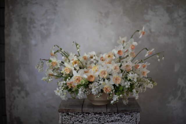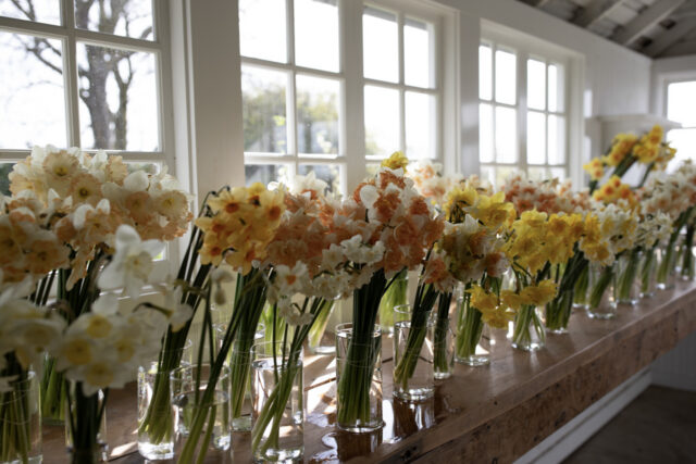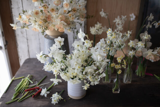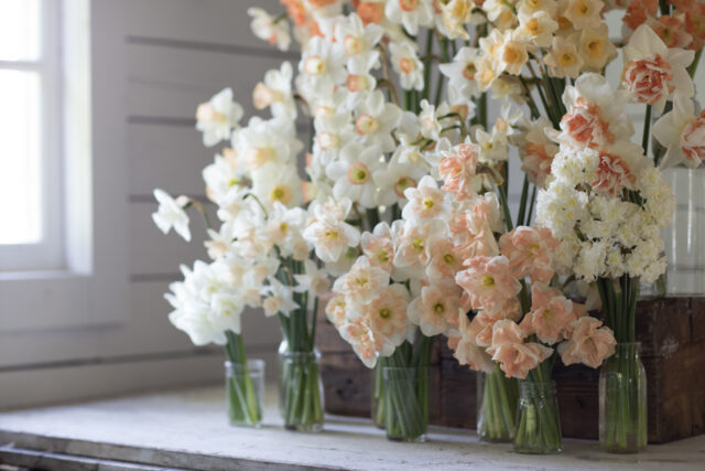 To do this, place freshly cut stems into cool water, on their own, for 2 to 3 hours. During that time, the stem ends will callus over and the sap will stop flowing. After that, they can be added to arrangements—just don’t recut the stems because they will start leaking again. If you’re arranging daffodils on their own, no special conditioning is required.