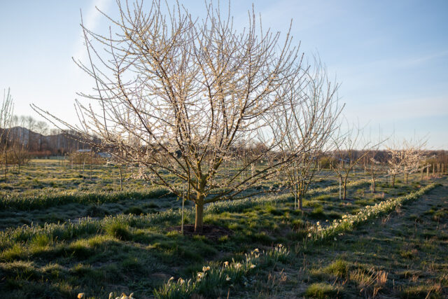 We also grow quite a few daffodils around the farm. Rather than placing them in rows in beds, they are planted in informal, natural-looking drifts in the grass, where they can multiply and spread over time, called naturalizing.