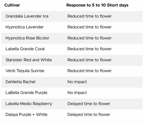 For the dahlia cultivars investigated, five to 10 short days (Figure 1) was enough to reduce the time to flower by three to 24 days with an increase in flower bud count. Furthermore, providing 15 or more short days promoted tuber formation, reduced flower number and reduced flower quality (Figure 2). There were some differences between cultivars (Table 1). For ‘Grandalia Lavender Ice’, ‘Hypnotica Lavender’, ‘Hypnotica Rose Bicolor’, ‘Labella Grande Coral’, ‘Starsister Red & White’ and ‘Venti Tequila Sunrise’, exposure to SDs reduced TTF compared to plants under continuous LDs.