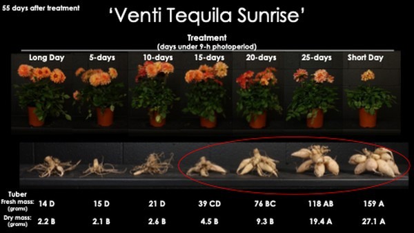 © Michigan State UniversityFigure 2. Fifty-five days after treatment, Dahlia ‘Venti Tequila Sunrise’ had significant tuber production and produced fewer flowers, resulting in lower-quality potted dahlias when exposed to 15 or more short days.