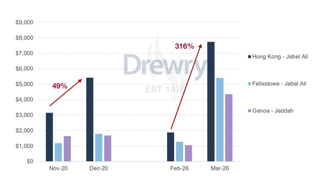 According to Drewry Container Freight Rate Insight data updated yesterday, spot ocean rates on East-West and North-South routes during the peak of Covid shipping disruptions in 2020 were both higher and more volatile than those experienced by typical spot market shippers in the first month of the Iran conflict.