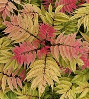 Sorbaria sorbifolia Crimson Feather (‘Hyfaria’) PP36,847 (pictured right) – A spectacular breakthrough in the Sorbaria family, Crimson Feather erupts with vivid crimson-red new growth that glows against its feathery golden and lime-green foliage. This compact, ultra-hardy, and disease-free shrub brings bold color from spring into summer and shines in borders, containers, Japanese-style gardens, or as a pollinator-friendly low hedge—truly a standout in any landscape. Hardy to zone 7b.