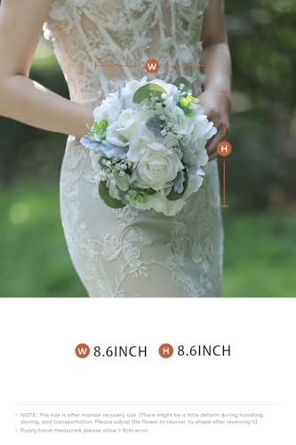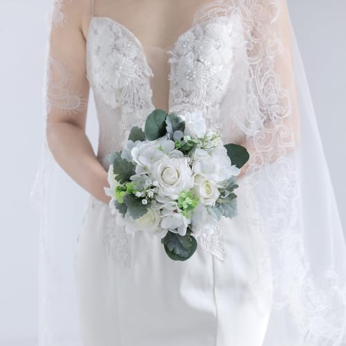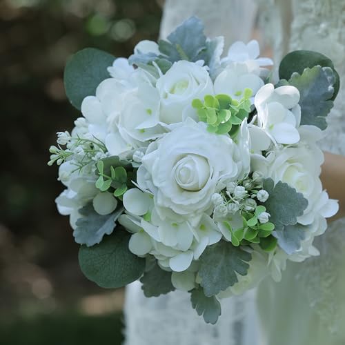 8.6 Inch Wedding Bouquets for Bride Bridesmaid, White Faux Real Touch Roses & Hydrangeas Wedding Bouquet, Baby’s Breath, Dusty Millers, White Greenery Bouquets