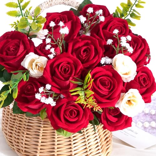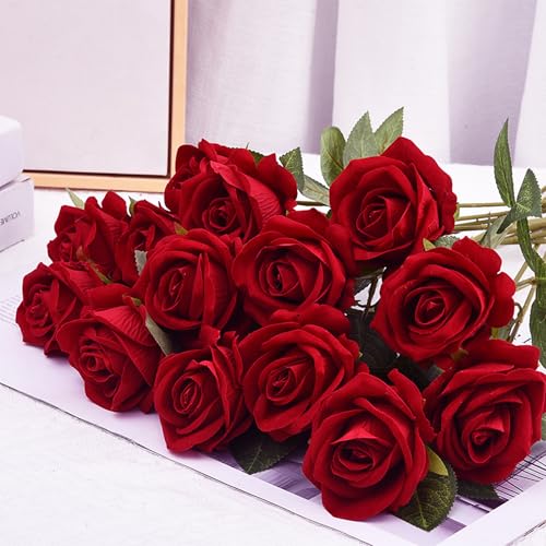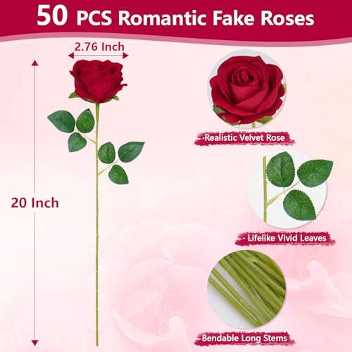 Specification: BLEUM CADE 50 Pcs Red Roses Artificial Flowers, Real Touch Velvet Roses Fake Flowers Bulk, Artificial Roses Bouquet with Long Stems Bridal DIY Wedding Party Centerpiece Decorations
