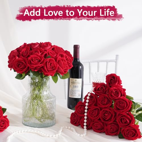 BLEUM CADE 50 Pcs Red Roses Artificial Flowers, Real Touch Velvet Roses Fake Flowers Bulk, Artificial Roses Bouquet with Long Stems Bridal DIY Wedding Party Centerpiece Decorations