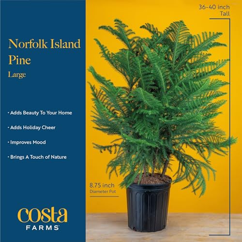 Norfolk Island Pine features solid, green foliage. The Norfolk Island Pineis great for large spaces. It does well in spaces that have bright, direct sunlight. Place Norfolk Island Pine in a spot that receives bright light (5 or more hours of sunlight). Water your plant about once a week with approximately 2-3 cups and be sure all excess water drains away. Adjust as needed for your environment. Do not let the Norfolk Island Pine sit in water or overly soggy soil. The height at shipping is approximately 36-inches tall, measured from the bottom of the pot to the top of the plant. The Norfolk Island Pine ships in a red, 10-inch décor pot. To avoid water spillage, this container does not have holes. The Norfolk Island Pine is a slow grower. Exact growth rate depends on the care provided and its environment. Give it a boost during the warm months of Spring and Summer with a general-purpose fertilizer that is formulated for potted plants. Follow the instructions on the fertilizer package for the best use. When the plant out grows the current container, it is time to repot. To repot the Norfolk Island Pine, gently remove it from its current container and place it into a slightly larger container. Fill in any empty spaces with new and fresh soil and water thoroughly. This plant is considered hardy in USDA Zone 10-11. Be aware of third-party sellers; other companies try to imitate our quality. There are no other authorized Costa Farms sellers. Look for ships from & sold by to ensure you’re getting our premium plants. Plants are living things; each one is slightly different, so the plant you receive may vary from the photo. Our growers hand-pick the healthiest and highest-quality plants. We package our plants for shipment with great care so they’ll arrive at your home ready to be displayed. Shipped fresh from our farm to you, Costa Farms is passionate about delivering happy, healthy, beautiful plants. Costa Farms plants are not intended for human or animal consumption. Keep out of reach of children and pets. Send us your feedback at questions@costafarms.