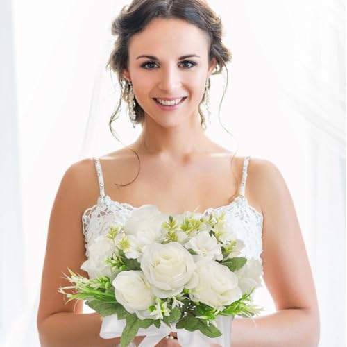 CYANLUX Wedding Bouquets for Bride Bridesmaid Bouquet Champagne White Artificial Roses Flowers for Wedding Valentine’s Day Church Home Decoration (White)…