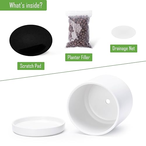 Planter pot with drainage hole, mesh drainage net and protective scratch pad included.