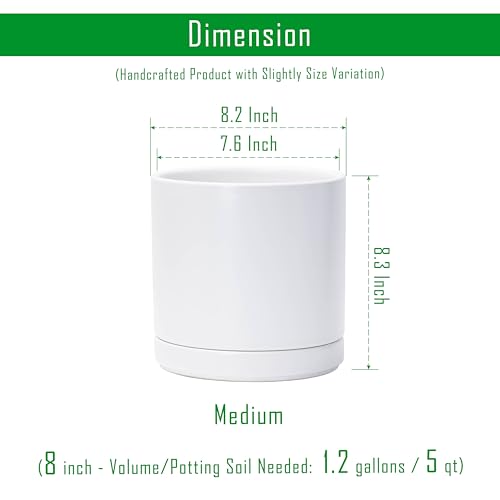 Medium 8 Inch Planter Pot: 8.2″ Diameter x 8.3″ H, white color. Potting Soil Needed: 1.2 gallons / 5 qt.