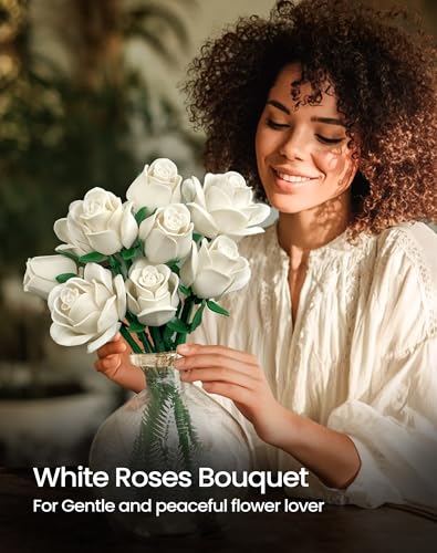 iATOM White Rose Bouquet Building Set, Wedding Artificial Flowers Botanical Collection for Adults Women, Gift for Christmas & Valentines Day – Home Office Table Centerpiece Decor – IA11013