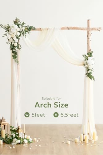 Package: Set of 4, including large corner flower swag x1(39.4″ L x 29.1″ W), tie-back flower x1(30″ L x 6″ W), white sheer drape x1, ivory sheer drape x1, and green zip ties x6. (wood arch stand NOT INCLUDE)