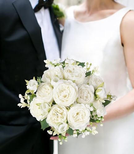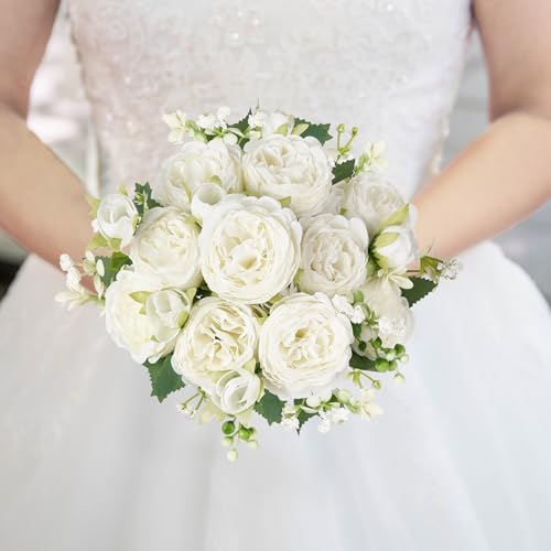 Mkono Peonies Artificial Flowers, Small Silk Flowers for Home Decor Indoor Fake Bouquet Faux Floral Arrangements Dining Table Centerpieces for Kitchen Bridal Wedding Party Decor White