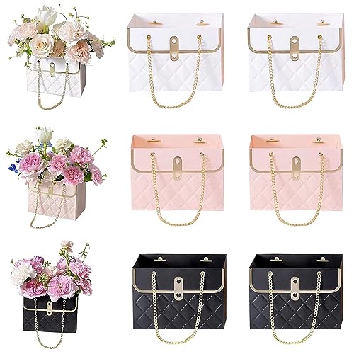 NADUSEP 6pcs Flower Paper Gift Box, Bouquet Storage Bucket Florist Handbag with Metal Chain Gift Case, Flower Boxes for Arrangements Wedding Valentine’s Mother’s Day Birthday Bridal Shower Graduation Anniversary Thanksgiving Christmas