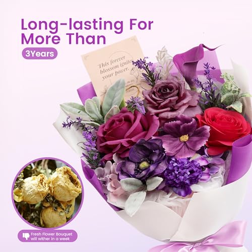 TINGE TIME Aritifical Flowers Bouquet, Purple Gift Bouquet, Birthday Gifts for Women, Eternal Roses Bouquet for Grandma Wife Anniversary