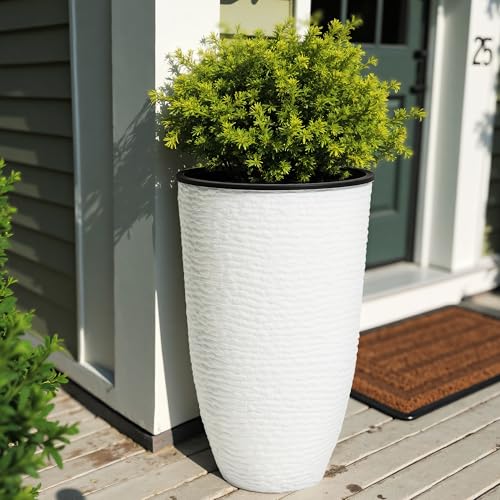 Specification: WORTH Garden 2-Pack 21″ H. White Tall Planters with Inside Pots – 14” Dia Plastic Large Round Plant Tree Pots – Decorative Imitation Stone Finish for Indoor Outdoor Front Porch Container Patio