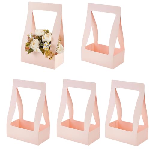 Ylapagne 5 Pieces Paper Flower Gift Bags, Pink Bouquet Flower Box with Handheld DIY Flower Arrangement Basket Flower Packaging Box for Valentine’s Wedding Anniversary Party